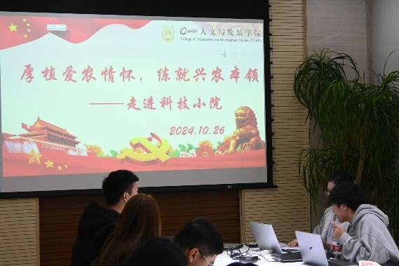 农大法学系张青同志的党课以“厚植爱农情怀,练就兴农本领”为主题,以习近平总书记回信精神为引领,带领大家走进“科技小院”。