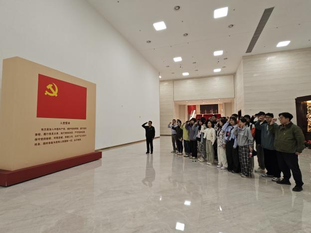 在党史展览馆入党誓词前,教师党支部书记朱言言带领全体党员面向党旗庄严宣誓。“我志愿加入中国共产党……为共产主义奋斗终身!”铿锵誓言在展厅穹顶回响,坚定了初心使命。